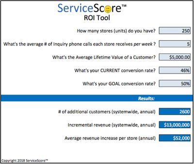 To help you measure the transformative impact to your business from increased call conversion, we've created the ServiceScore ROI Tool. With just five inputs, you can see the results from setting and achieving your inquiry conversion goals.